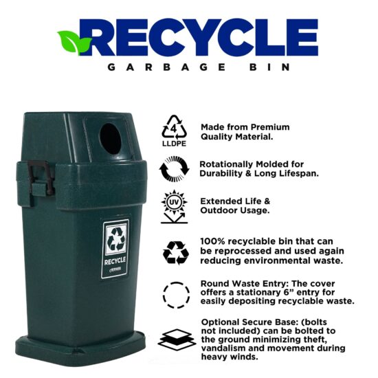 Designed to support efficient indoor and outdoor recycling programs, Rhino Recycling Bins are made from high-quality, rotationally molded materials for long-lasting durability. Whether used alone or grouped side-by-side, they create a clean, organized, and attractive recycling station.